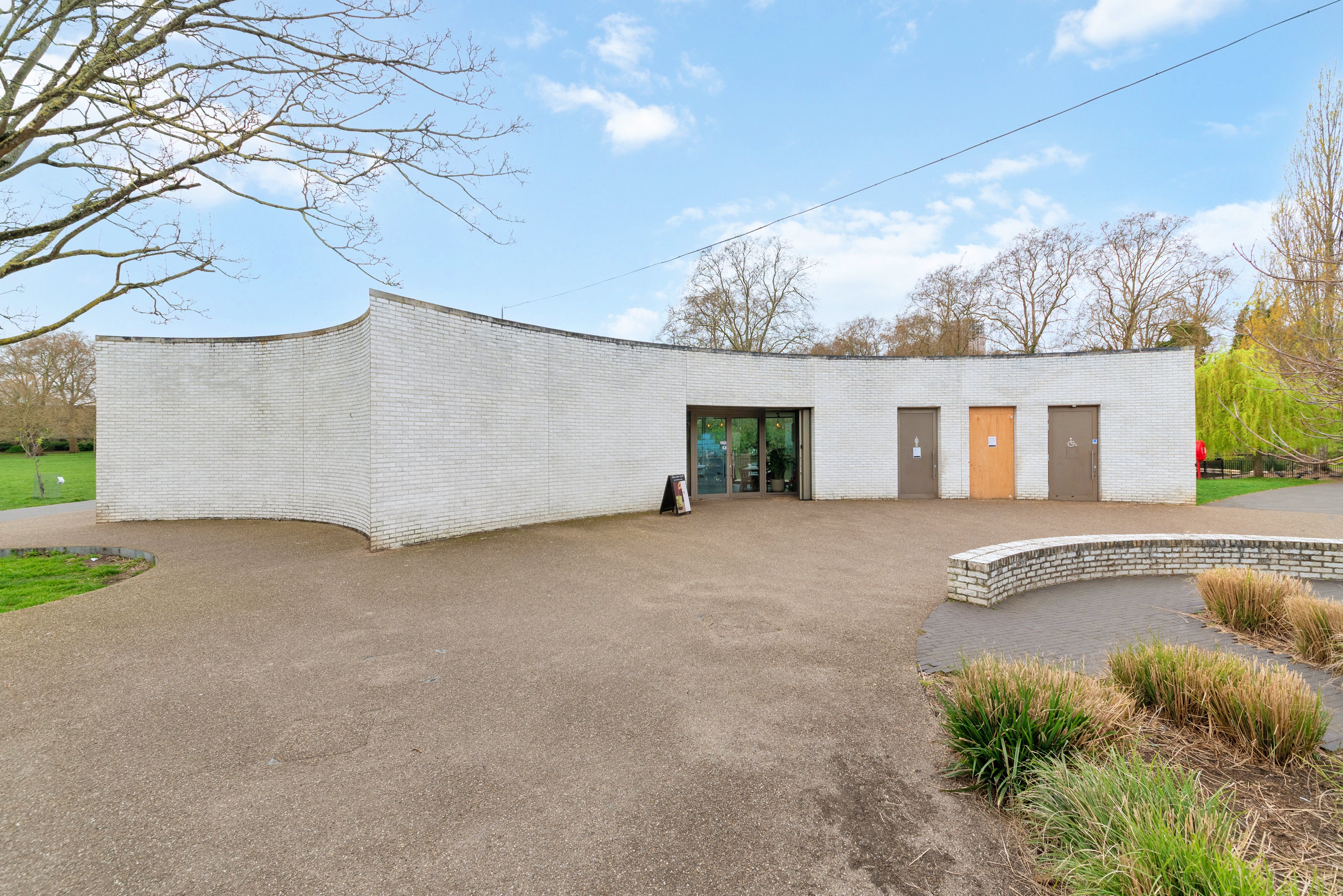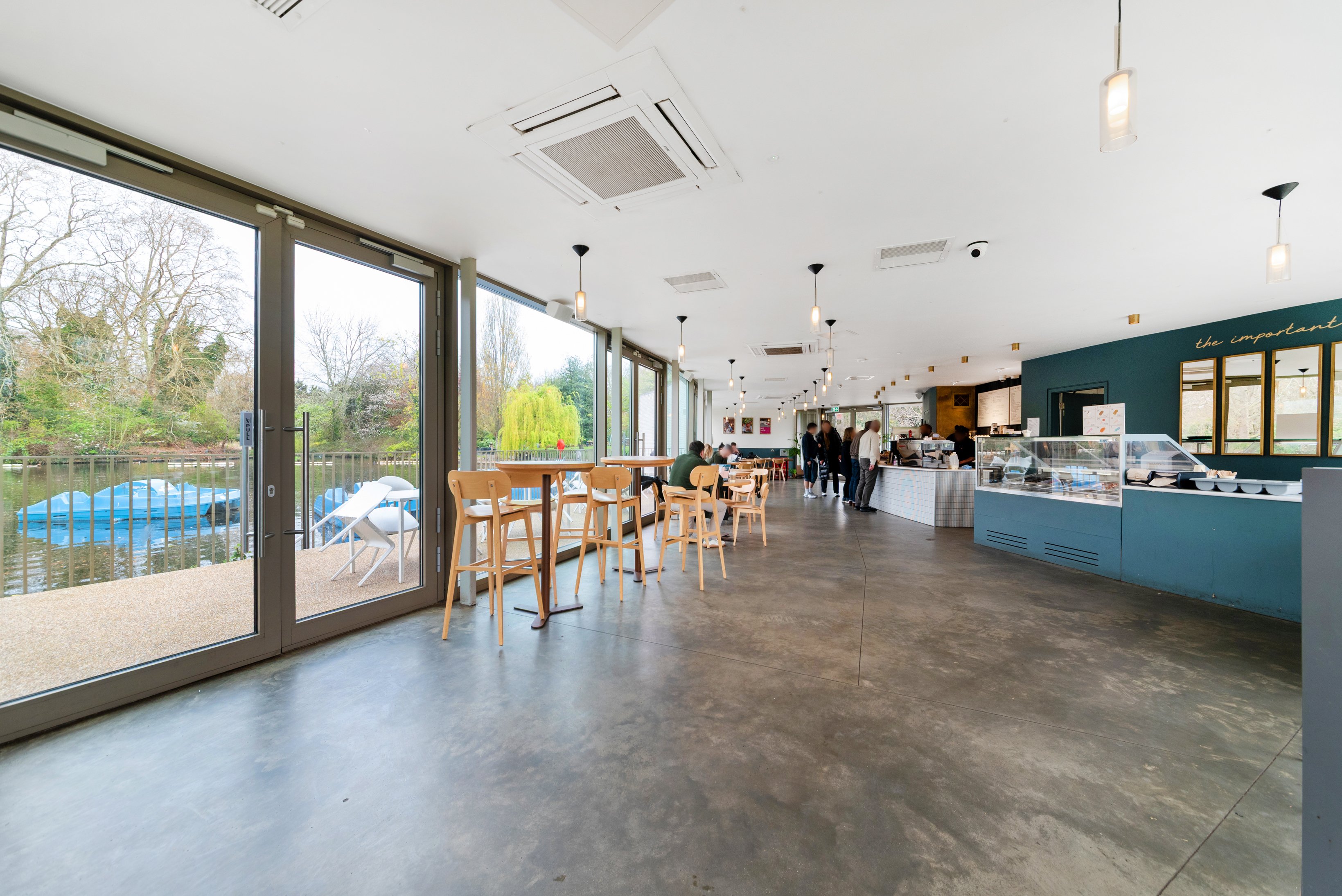 The property comprises a self-contained ground floor commercial unit arranged within a curved pavilion building, with a glazed frontage providing natural light and views across the lake.