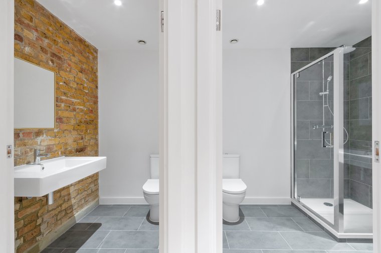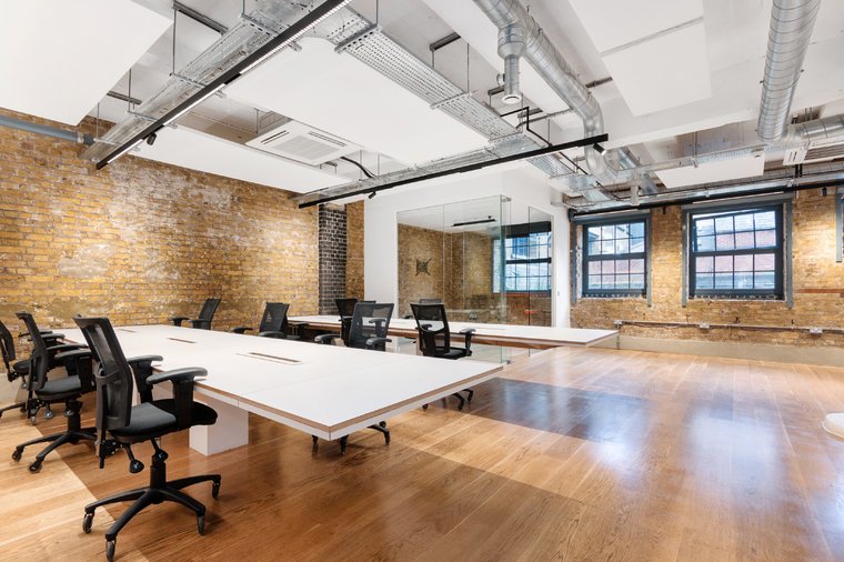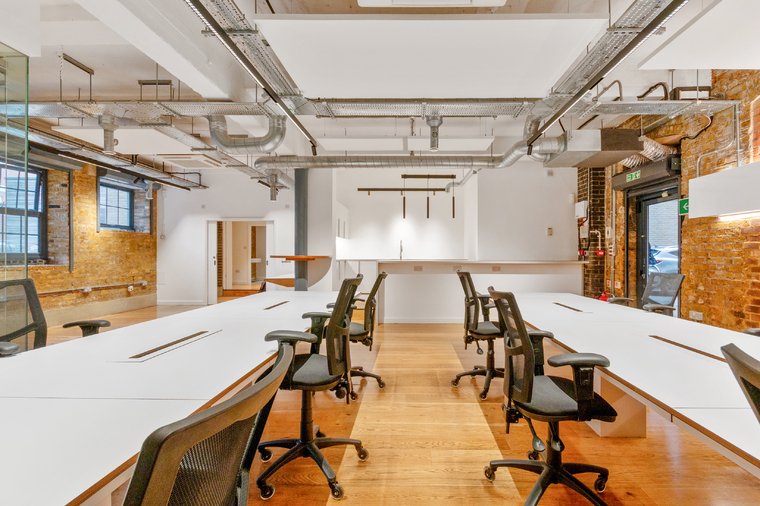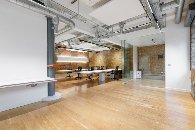 Recently refurbished this character office space is available for rent on the ground floor of a gated courtyard development. The self-contained unit offers an open-plan layout featuring a partitioned glass meeting room in the corner. The space includes two toilets, a kitchenette, and a dedicated storage area. It also boasts wooden flooring, air-conditioning, a mixture of spot and pendulum lighting, and exposed services.