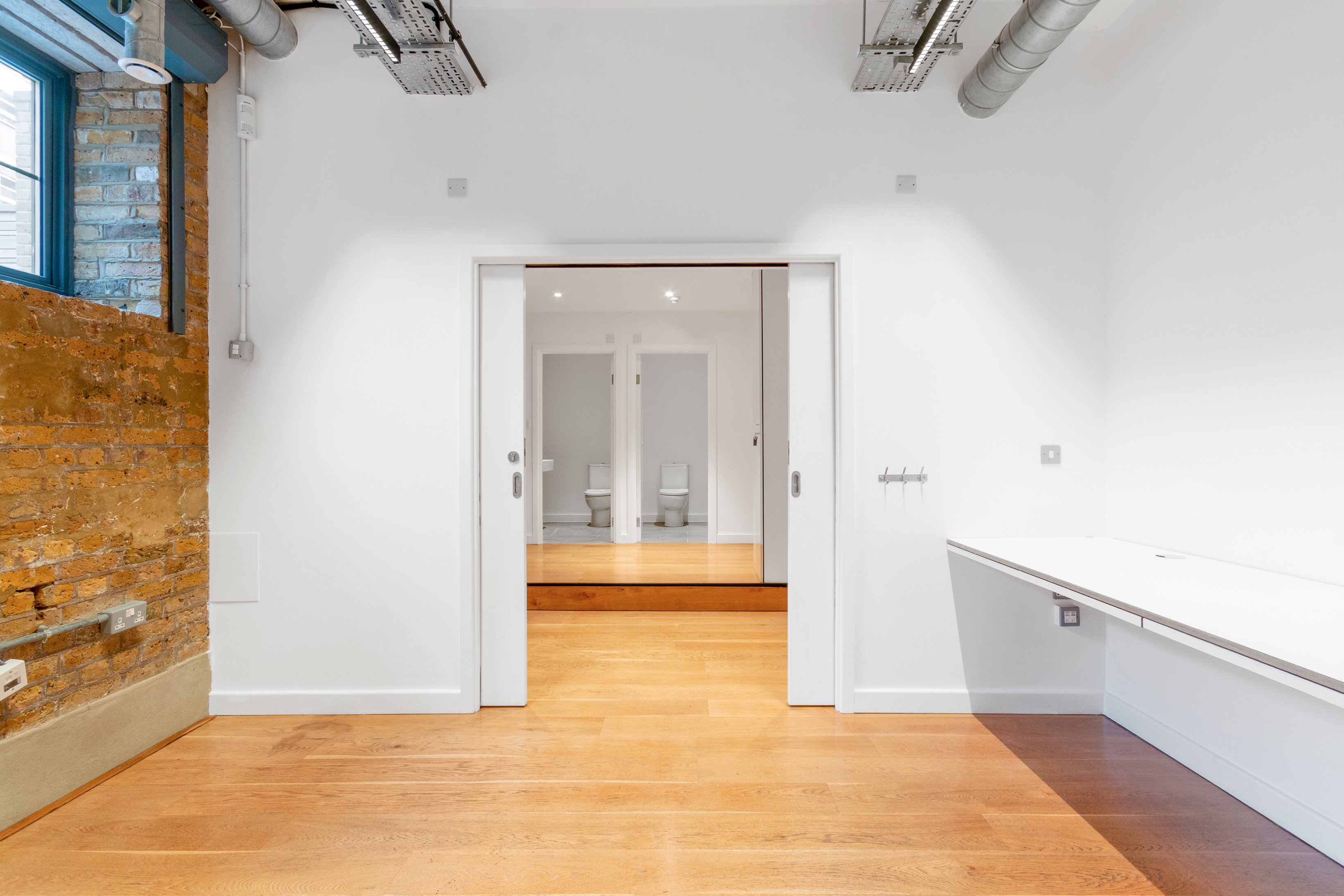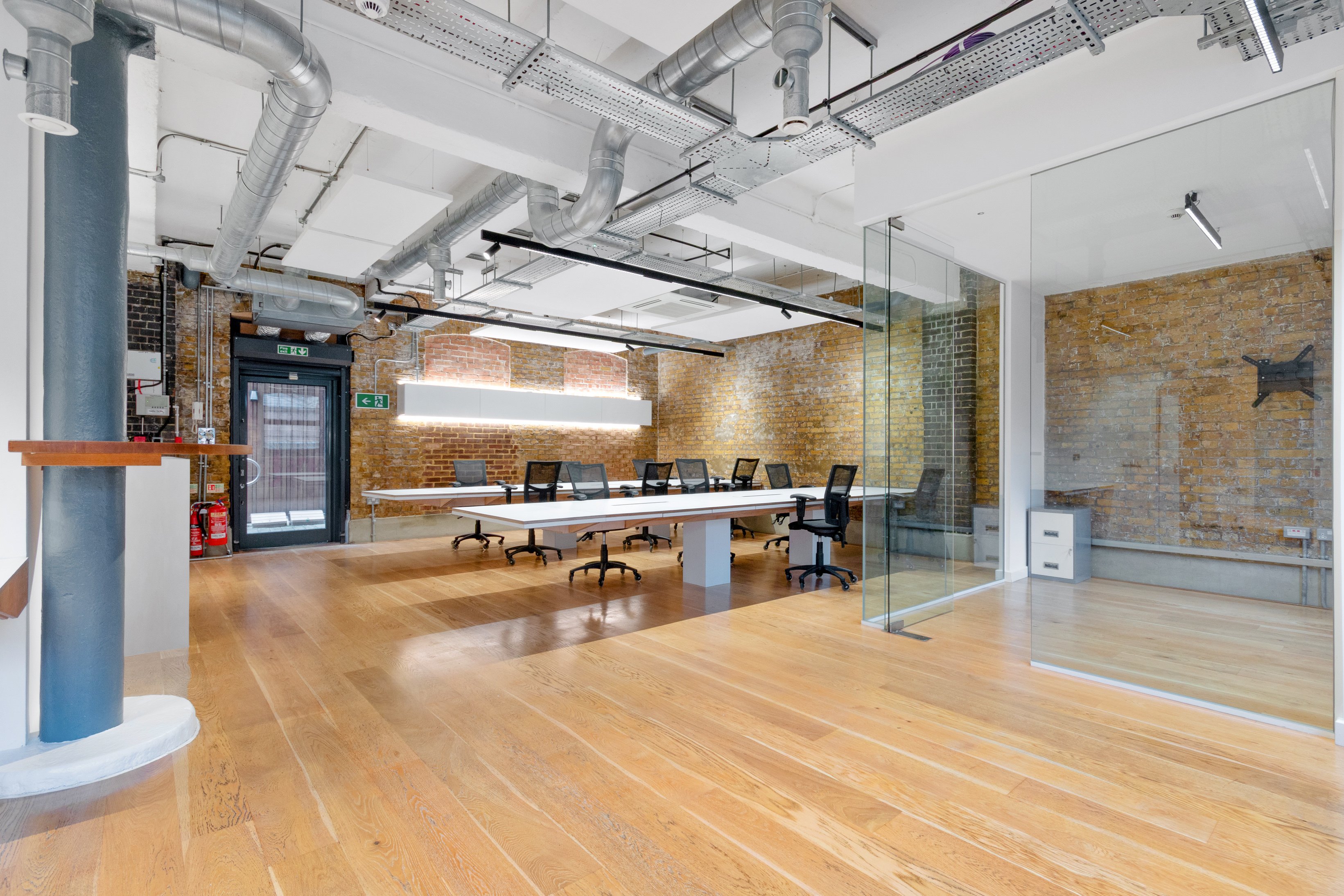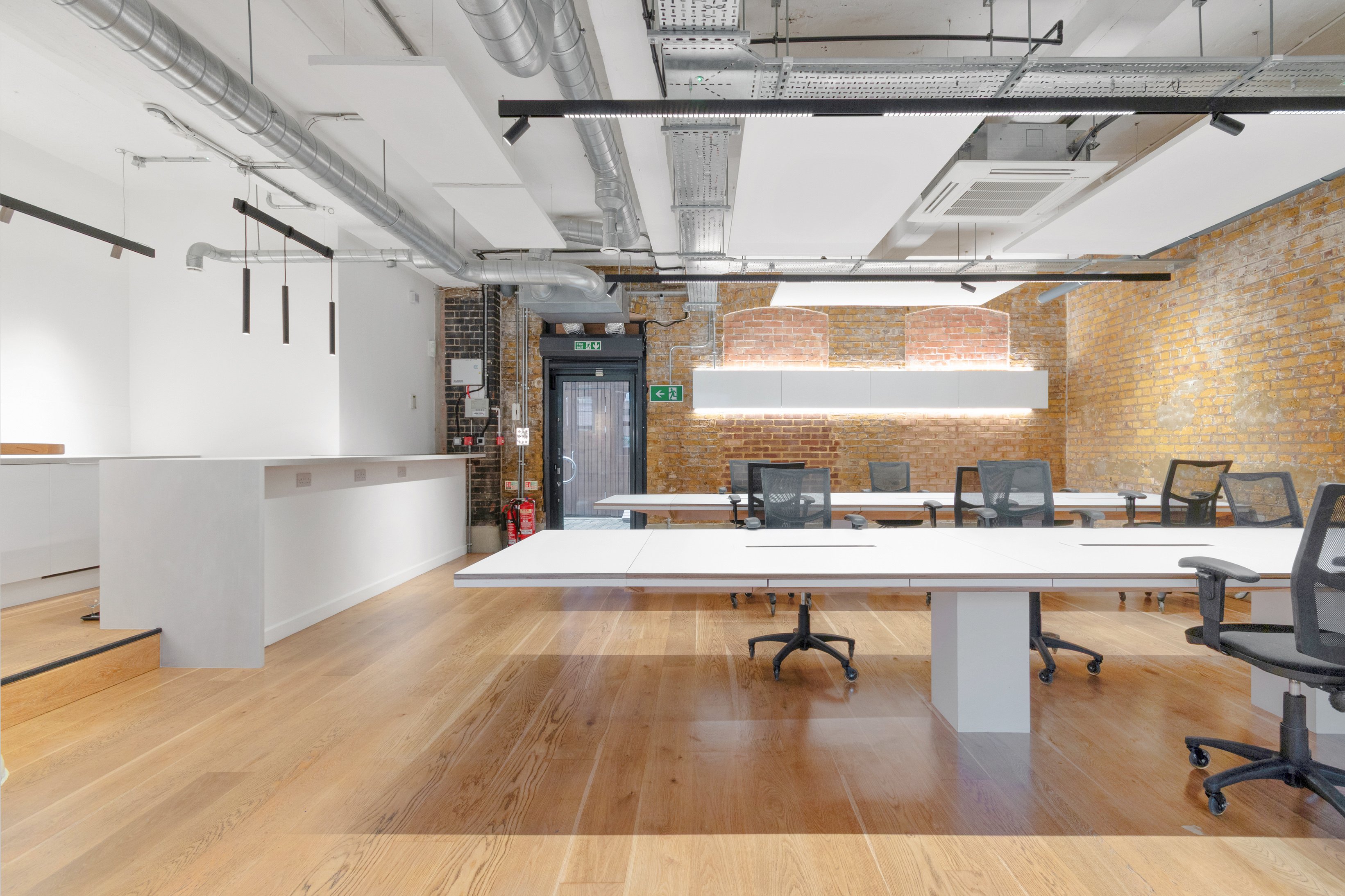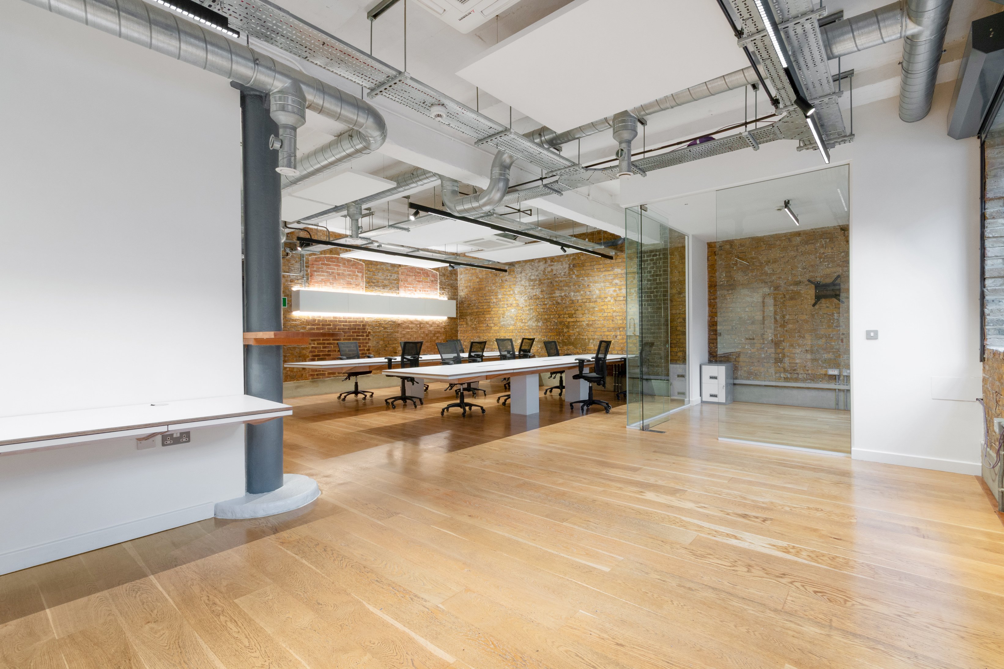 Recently refurbished this character office space is available for rent on the ground floor of a gated courtyard development. The self-contained unit offers an open-plan layout featuring a partitioned glass meeting room in the corner. The space includes two toilets, a kitchenette, and a dedicated storage area. It also boasts wooden flooring, air-conditioning, a mixture of spot and pendulum lighting, and exposed services.