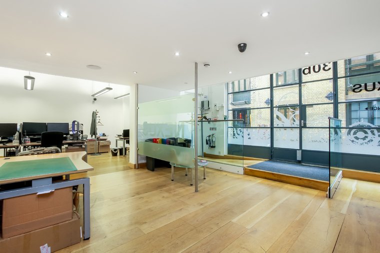 The office is located within a former spice warehouse, occupying the ground and mezzanine floors. It benefits from natural light provided by floor-to-ceiling windows along Shad Thames. The ground floor is primarily open-plan and includes two toilets and a kitchenette with a breakout area. The mezzanine level provides an additional office area and a partitioned meeting room. The office benefits from a raised floor with integrated floor boxes and Cat 6 network cabling.