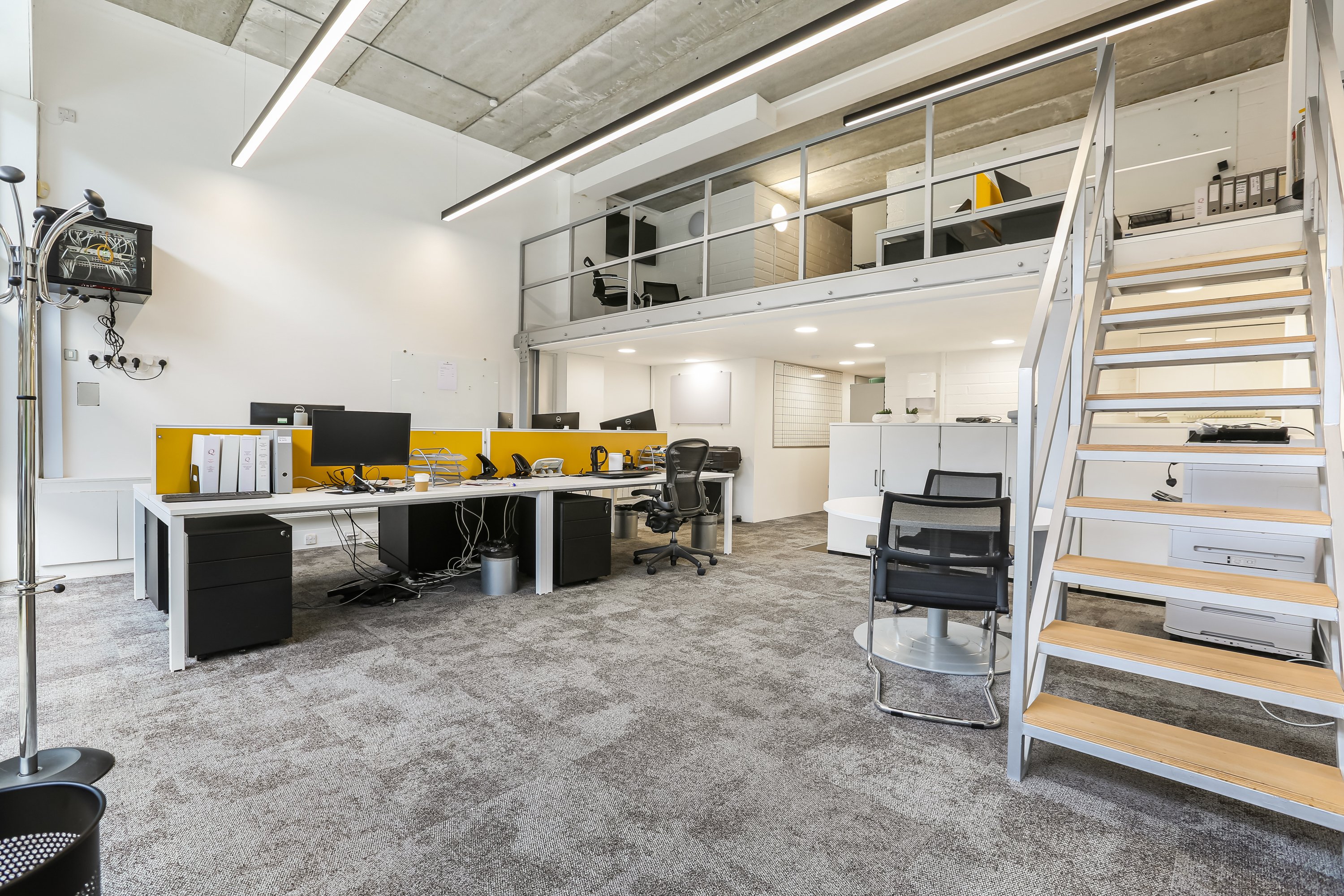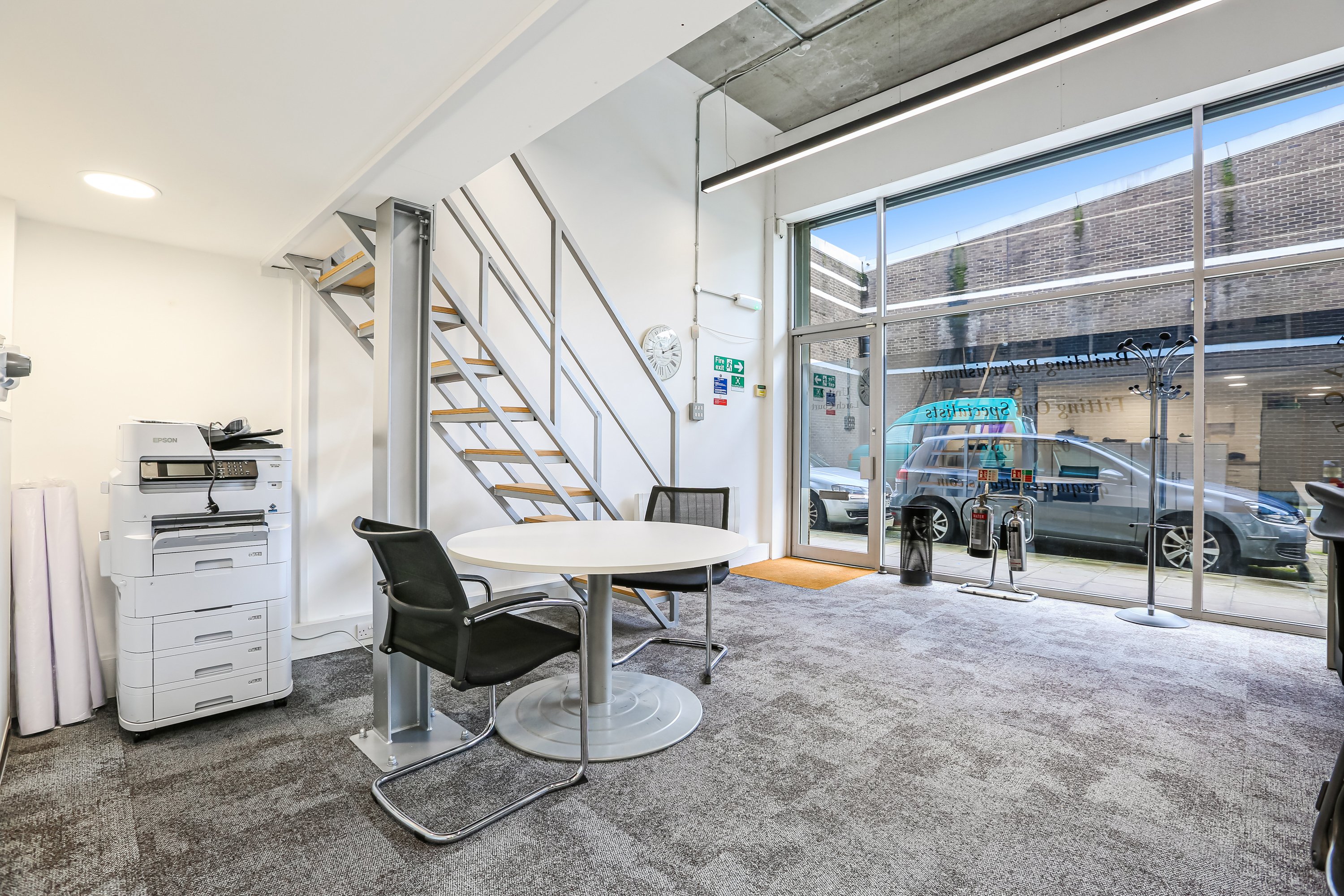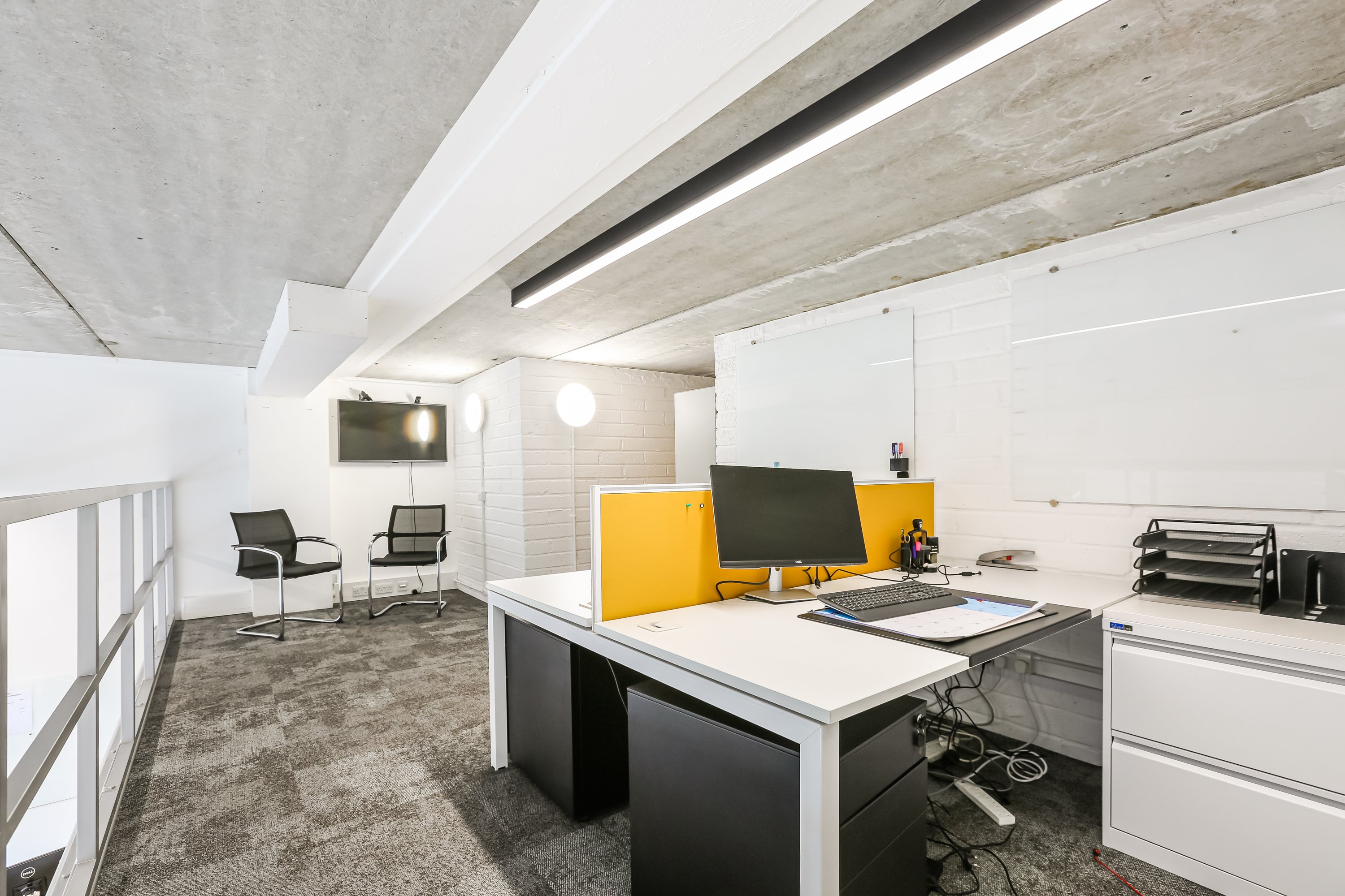 This stylish self-contained office is over two levels and benefits from floor-to-ceiling windows, offering lots of natural light to both the ground and mezzanine levels. The unit has carpeted flooring, with painted brick walls and an exposed concrete ceiling. There is a kitchenette and a toilet with a shower on the ground floor level and storage on the mezzanine. The unit is fully network cabled. The property also has electric roller shutters and a security system installed.