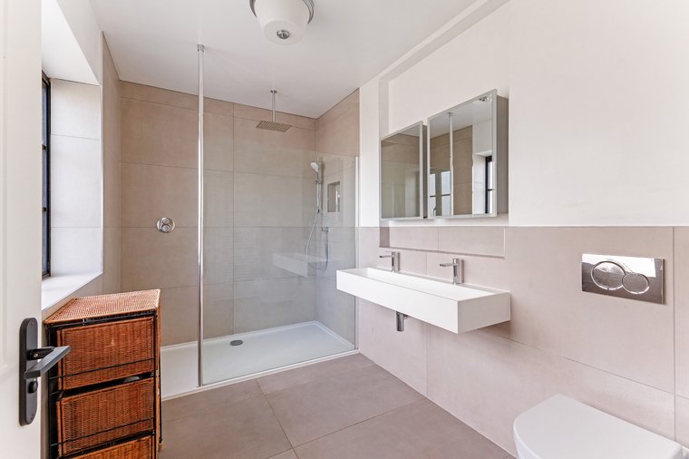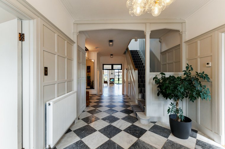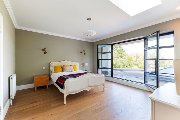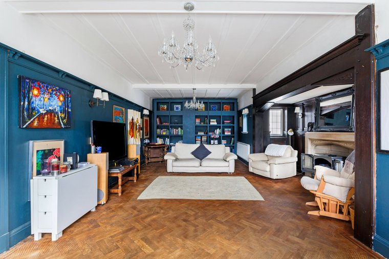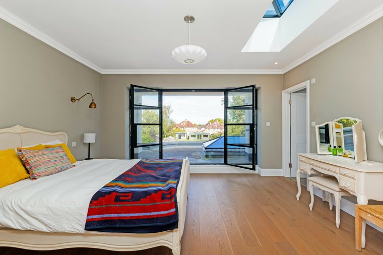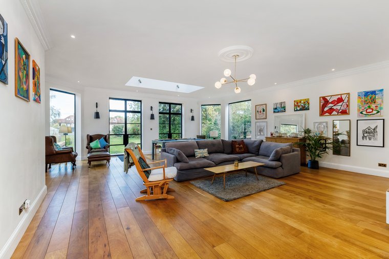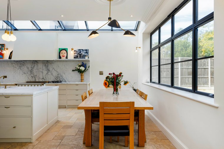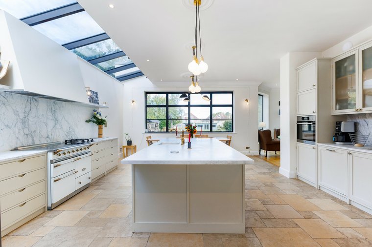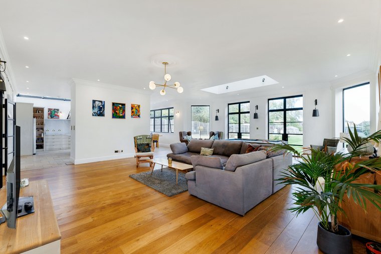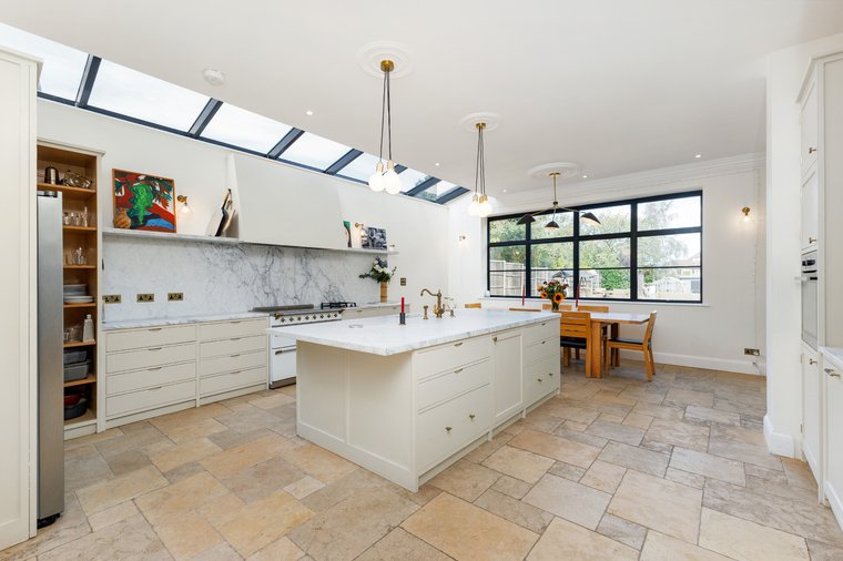 At the heart of the home is a light-filled open-plan kitchen and dining space, complete with Carrara marble worktops, a walk-in larder, Quooker and Perrin & Rowe taps, two dishwashers and an extra under-counter fridge. The home also offers three reception rooms, a separate utility room with granite worktops with high-spec finishes throughout, including high ceilings, hardwood, marble, and limestone floors, Buster + Punch lighting, and Bluetooth-enabled mirrors.