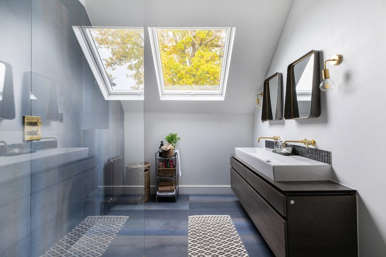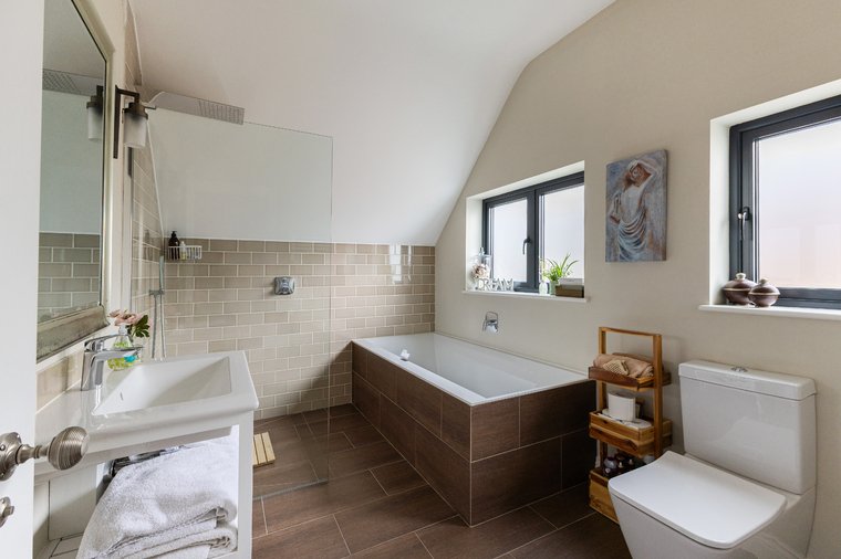 The open-plan kitchen/dining room forms the hub of this home. Integrated Sonos speakers and large sliding doors which open onto a paved patio and courtyard allows for a great atmosphere and indoor/outdoor living. Equipped with an oversized SMEG range cooker and appliances, electric skylights and a separate utility room, the kitchen has everything you need.