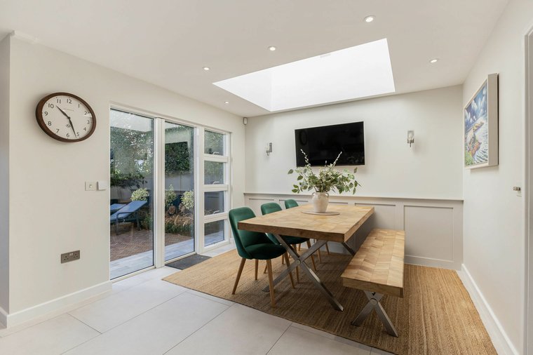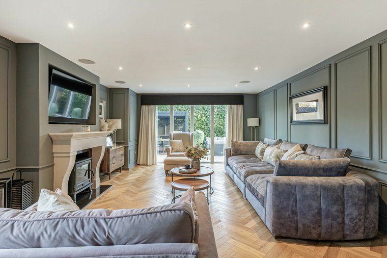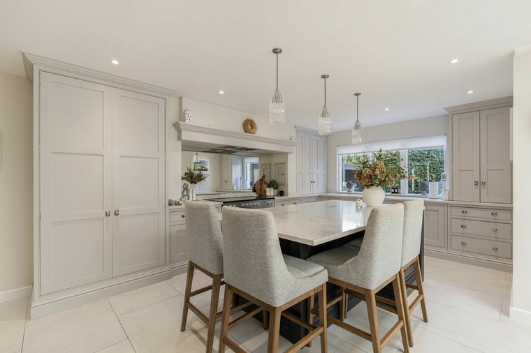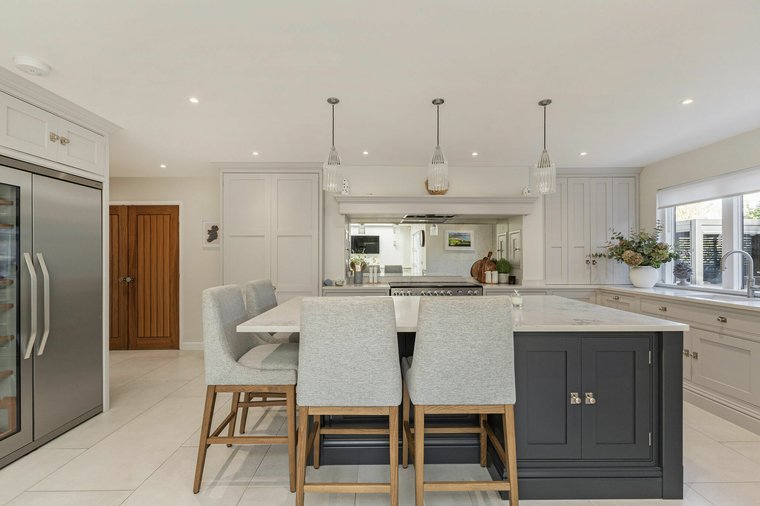 The open-plan kitchen/dining room with doors on to the garden forms the hub of this home. A bespoke kitchen with dovetail joinery has been thoughtfully designed and comes equipped with a Quooker tap, Nexus Rangemaster oven and hob, as well as a fridge, freezer and wine cooler. An incredible breakfast and food pantry is a testament to the joiner's skill.