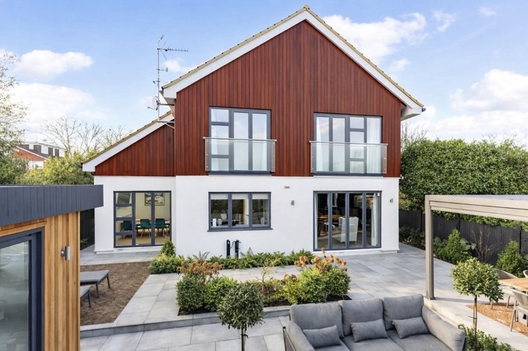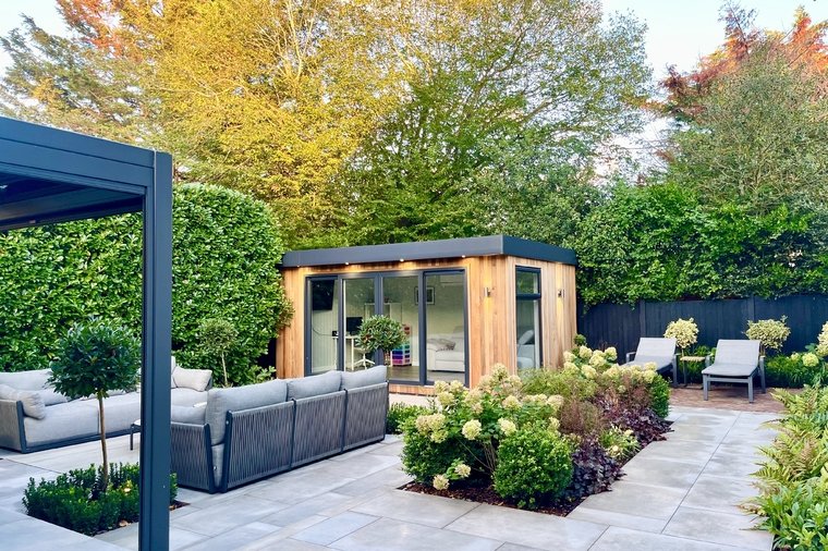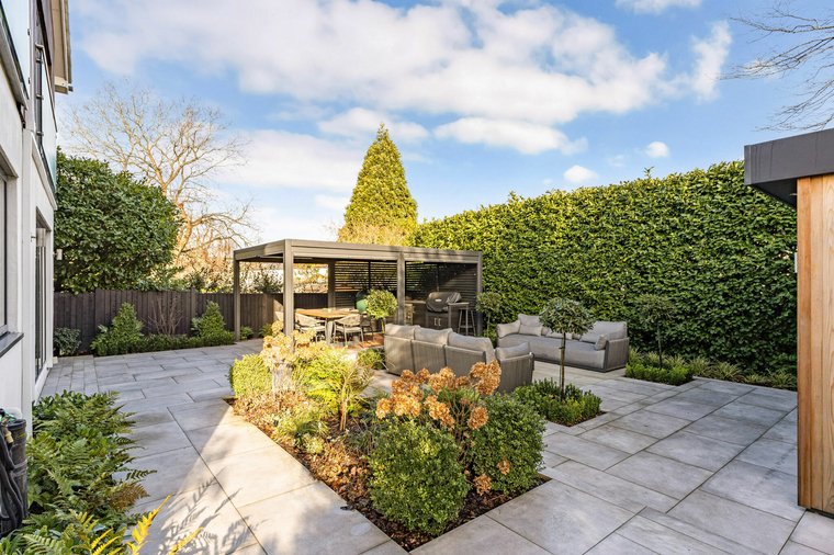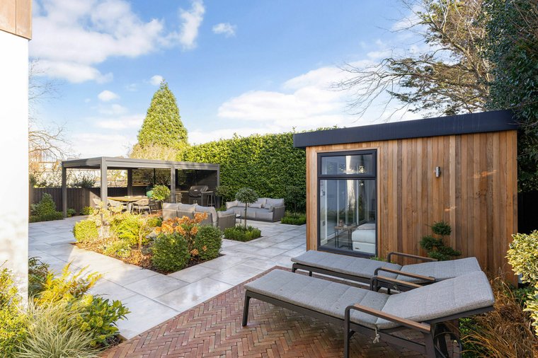 The rear garden space has been well thought out. The space is fully landscaped to be low maintenance and comes complete with an outdoor kitchen/dining area as well as an outbuilding with internet, electricity and heating/aircon.