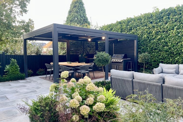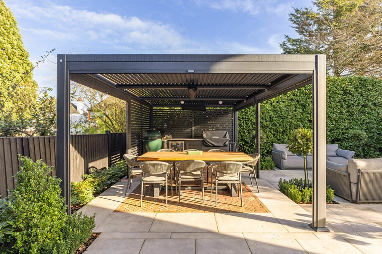 A pergola with shutters (blocking rain and wind) houses an outdoor kitchen fitted with Dekton countertops, large beefeater gas BBQ, fridge and dining area. Heaters and lighting allow for use outside of summer months.